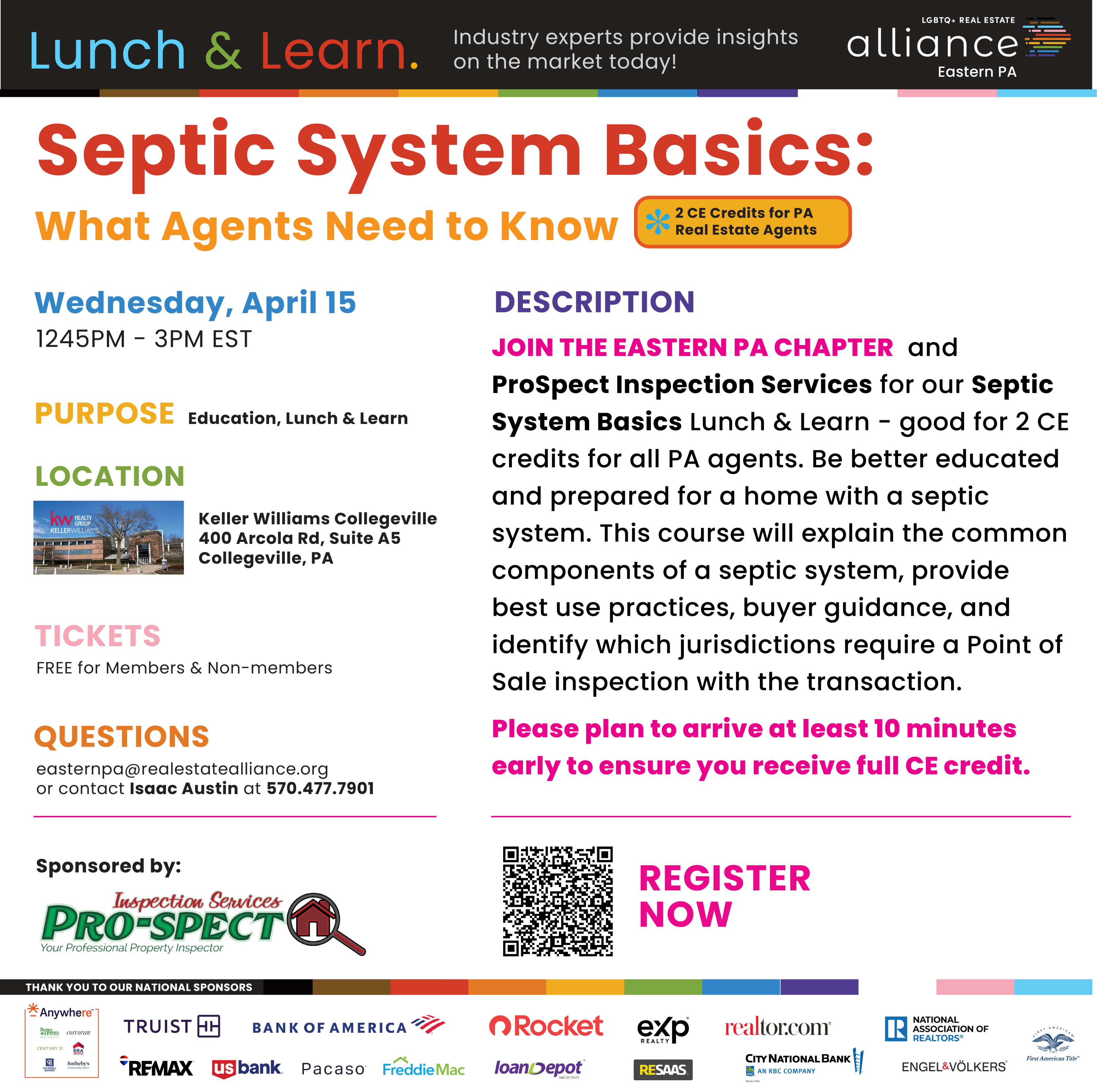 Join the Eastern PA Real Estate Alliance and ProSpect Inspection Services for our Septic System Basics Lunch & Learn - good for 2 CE credits for all PA agents. Be better educated and prepared for a home with a septic system. This course will explain the common components of a septic system, provide best use practices, buyer guidance, and identify which jurisdictions require a Point of Sale inspection with the transaction. Please plan to arrive at least 10 minutes early to assure you receive your CE credit. Class starts promptly at 1:00pm.