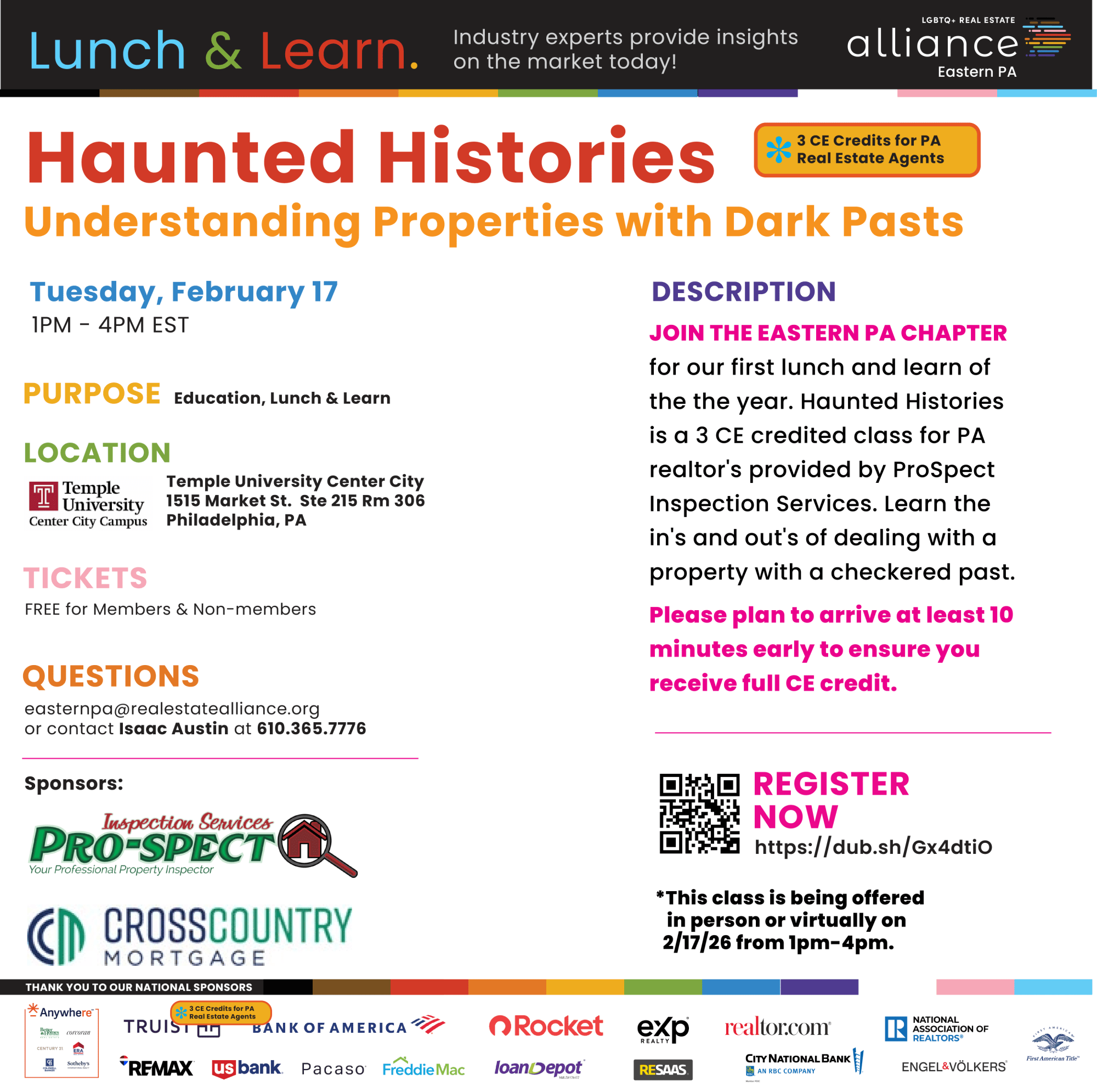 Join the Eastern PA Chapter for our first lunch and learn of the the year. Haunted Histories is a 3 CE credited class for PA realtor's provided by ProSpect Inspection Services. Learn the in's and out's of dealing with a property with a checkered past. This class is being offer in person or virtually on 2/17/26 from 11am-2pm.